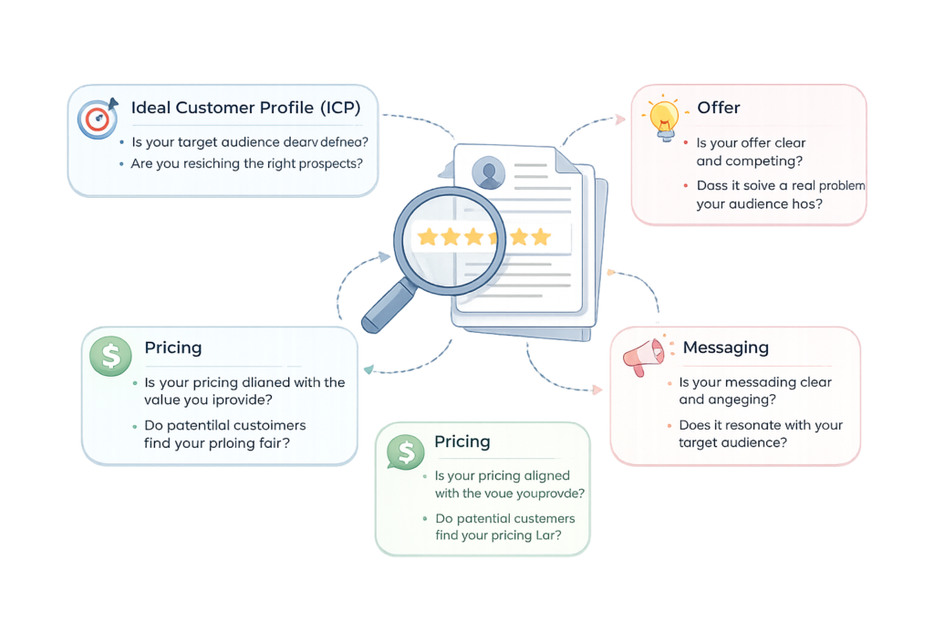 Targeted feedback on ICP, offer, pricing, outreach, proposals, assets.